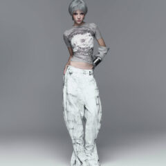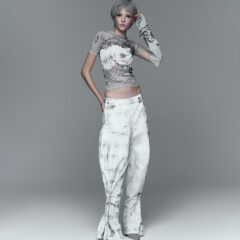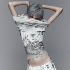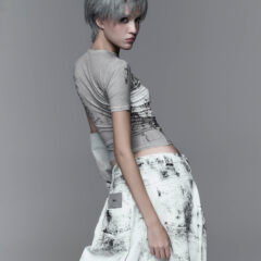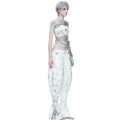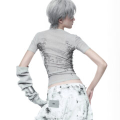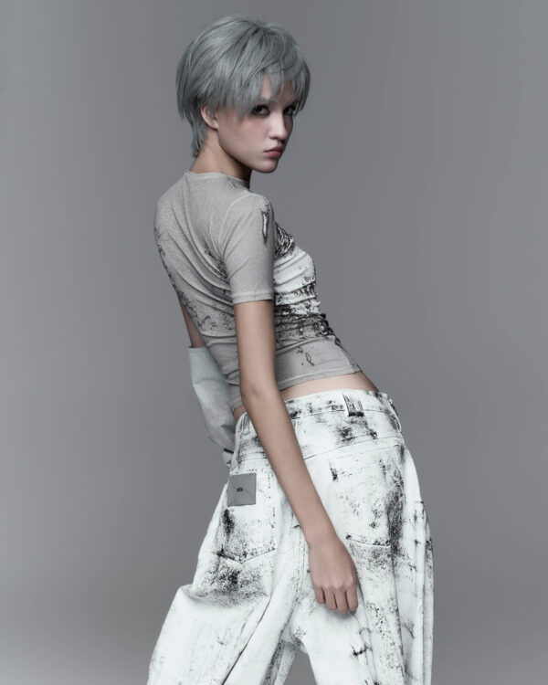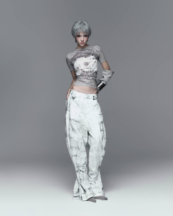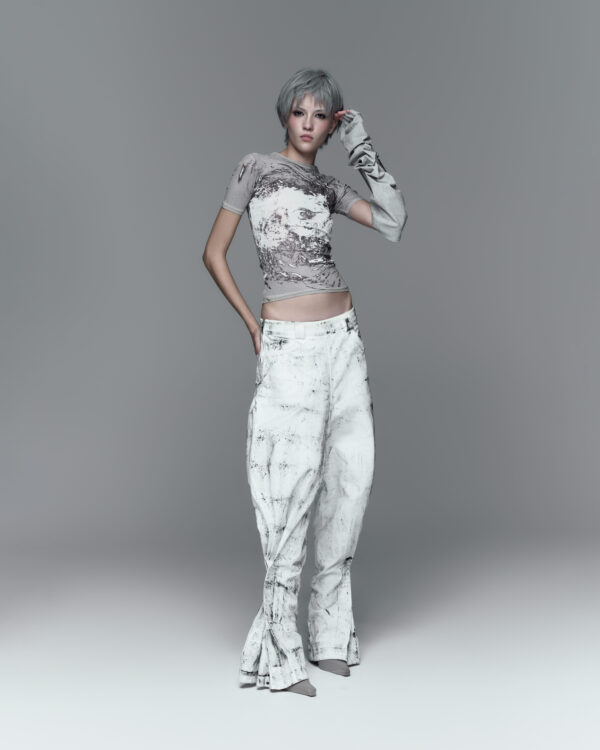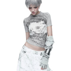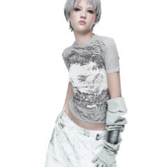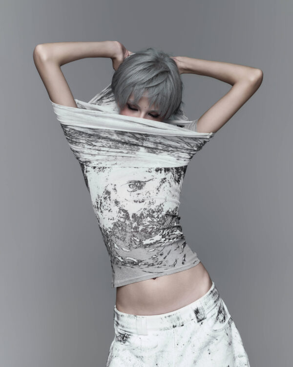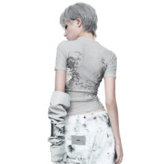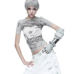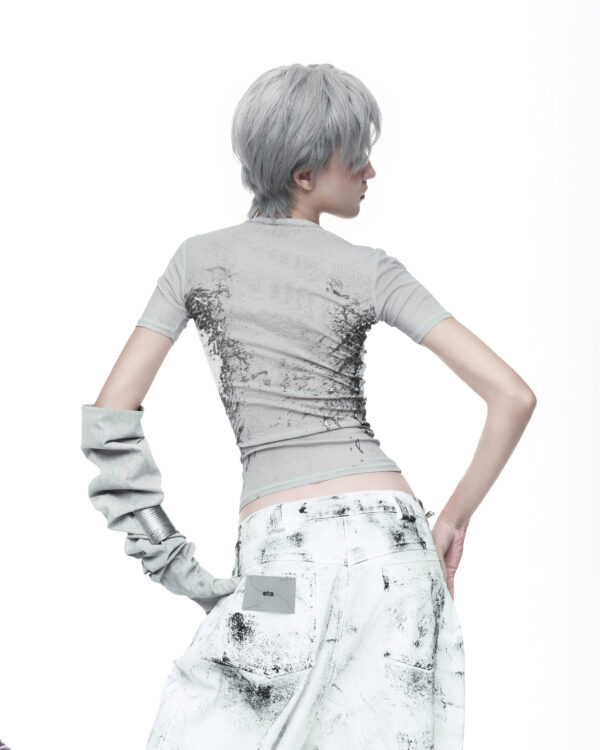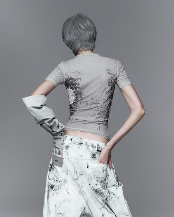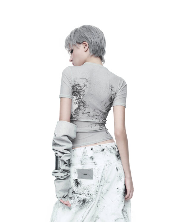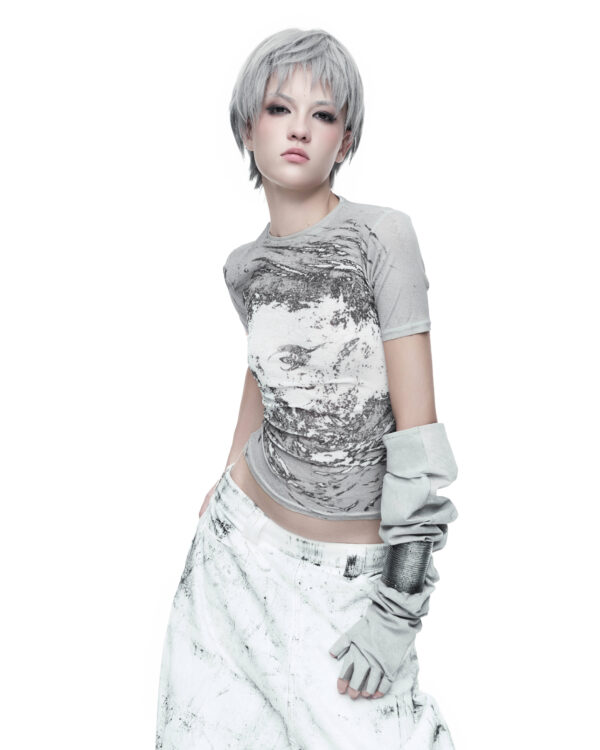 Áo thun làm từ chất liệu thun giấy mỏng nhẹ. Form ôm nhẹ theo cơ thể được in đồ họa xoáy nước toàn thân gợi hình ảnh cơn bão đang hình thành.