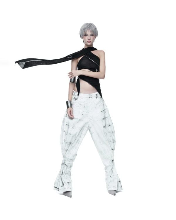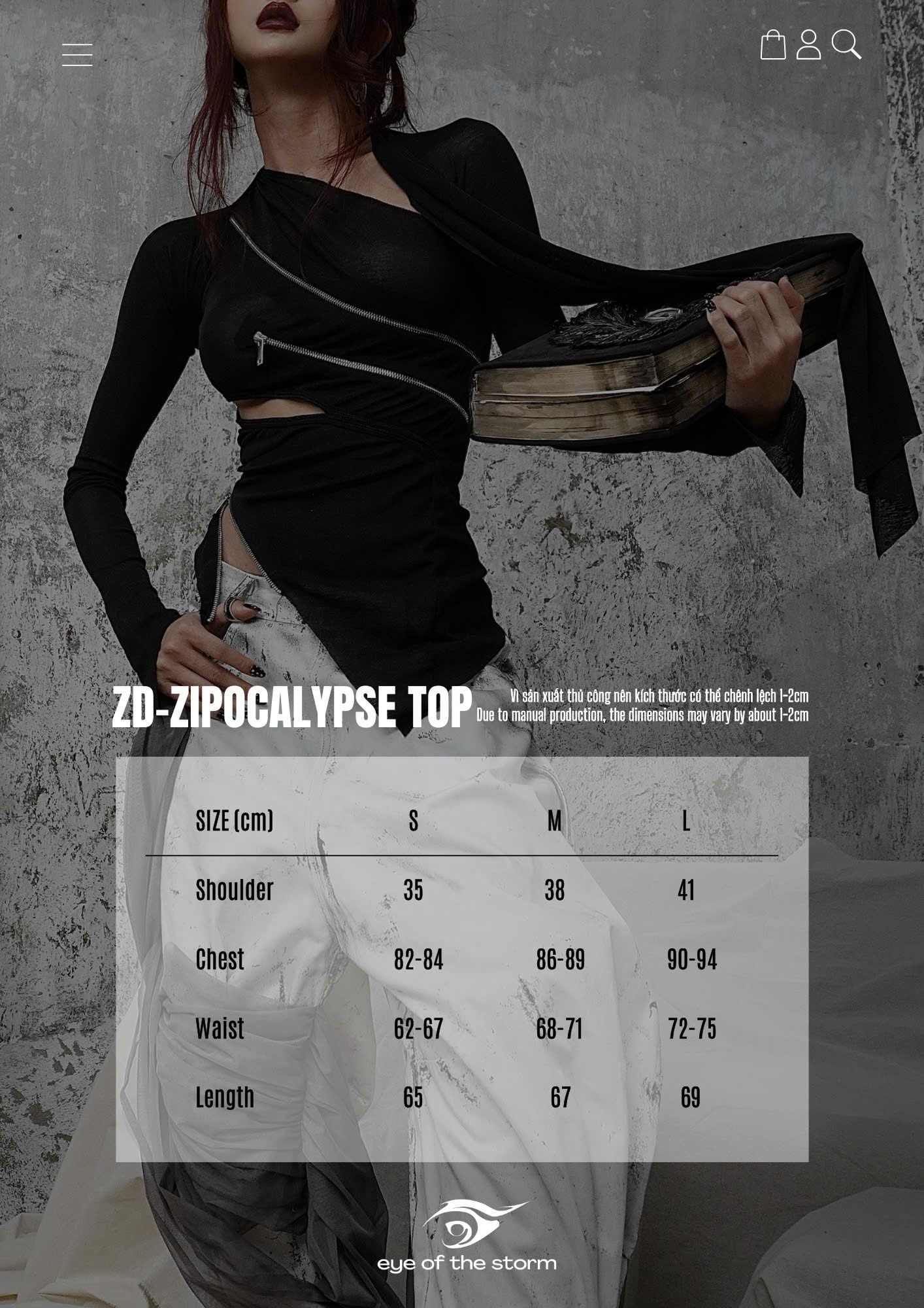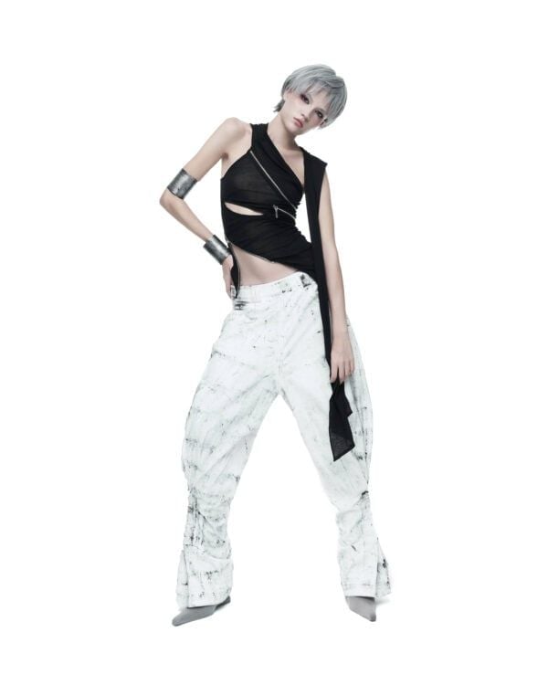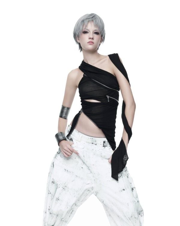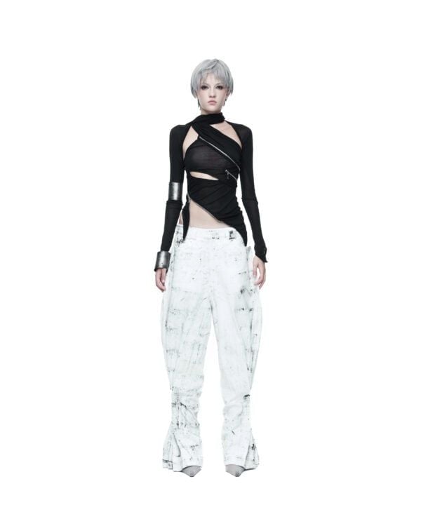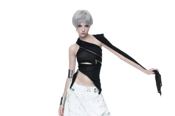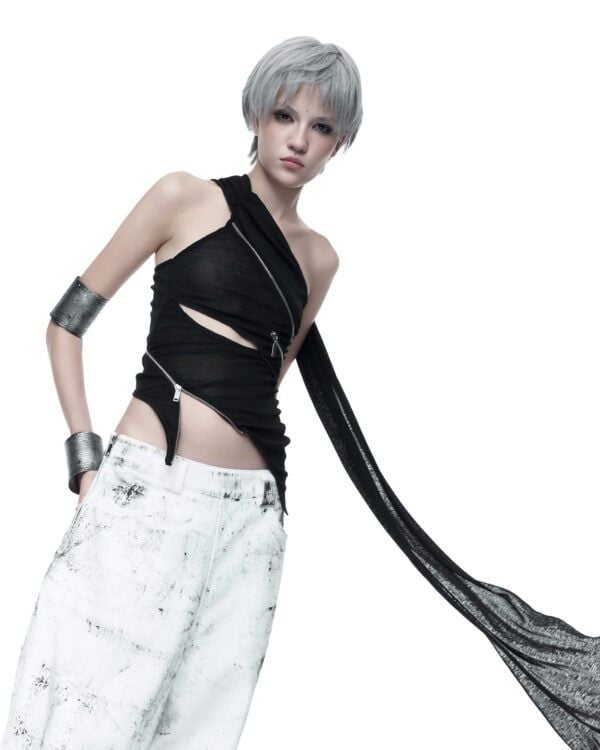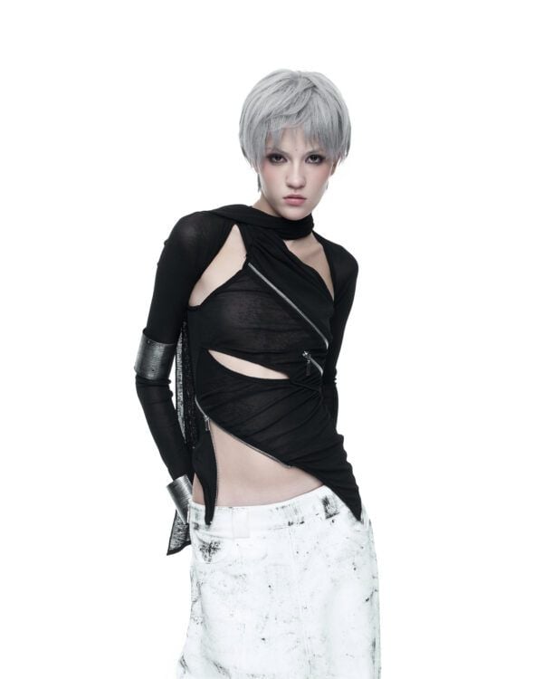 Áo dài tay được tạo hình bằng các đường khóa kéo bất đối xứng, cho phép tùy chỉnh độ mở và form ôm của thân áo. Chất liệu thun giấy mỏng nhẹ, có độ rũ tự nhiên, tạo hiệu ứng layering và chuyển động linh hoạt theo cơ thể. Phần tay áo ngoài được may tách riêng, có thể tháo rời khi styling.