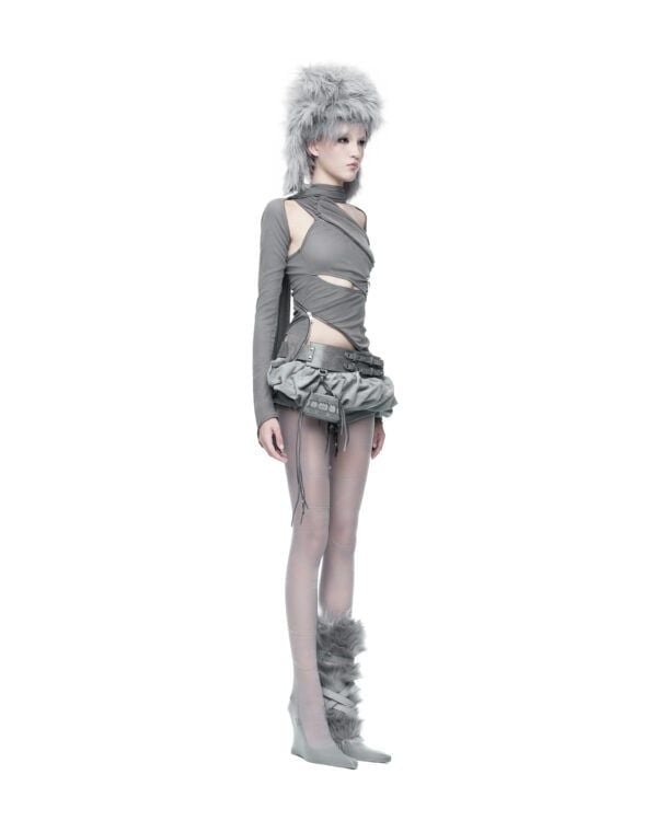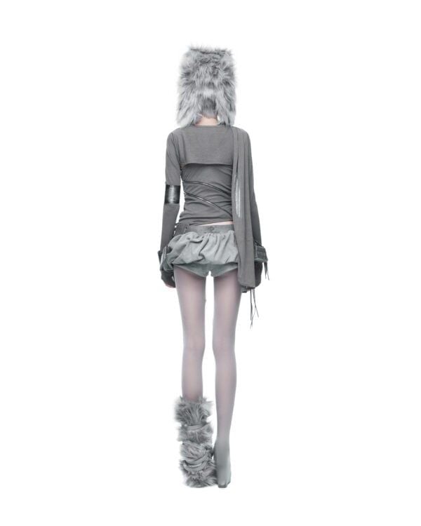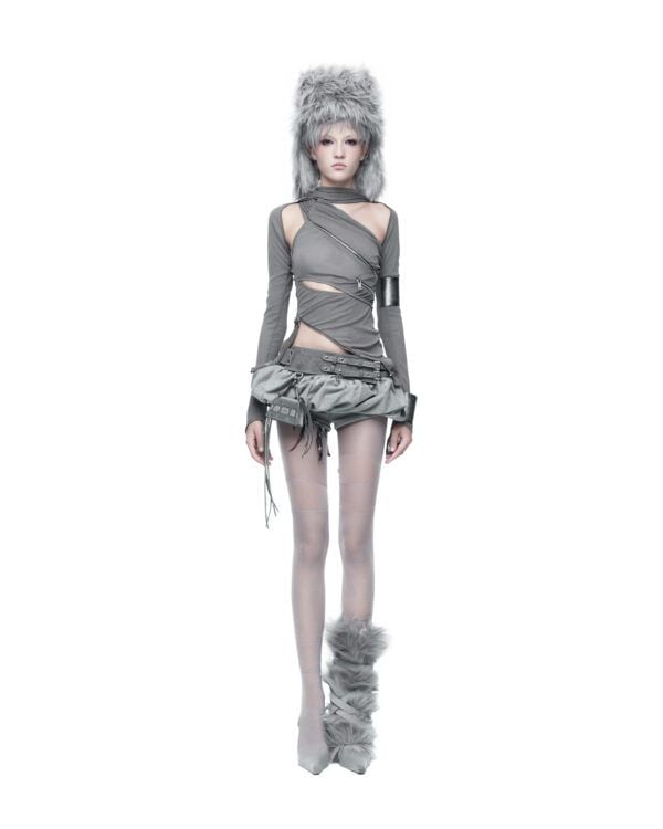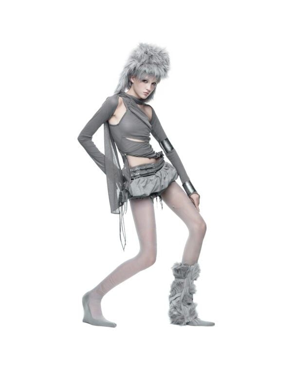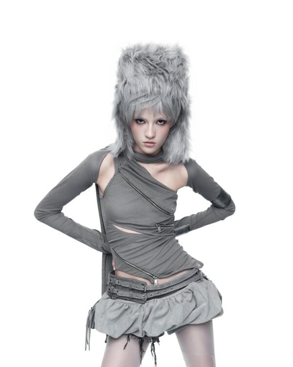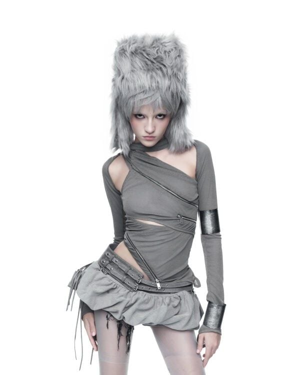 Áo dài tay được tạo hình bằng các đường khóa kéo bất đối xứng, cho phép tùy chỉnh độ mở và form ôm của thân áo. Chất liệu thun giấy mỏng nhẹ, có độ rũ tự nhiên, tạo hiệu ứng layering và chuyển động linh hoạt theo cơ thể. Phần tay áo ngoài được may tách riêng, có thể tháo rời khi styling.
